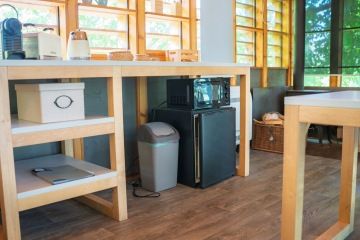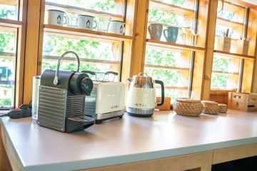 základní kuchyňské zázemí, kávovar, varná konvice, opékač topinek, lednička