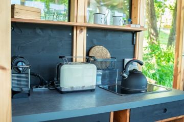 základní kuchyňské zázemí - kávovar, varná konvice, opékač topinek nebo plynový vařič, lednička, střešní terasa