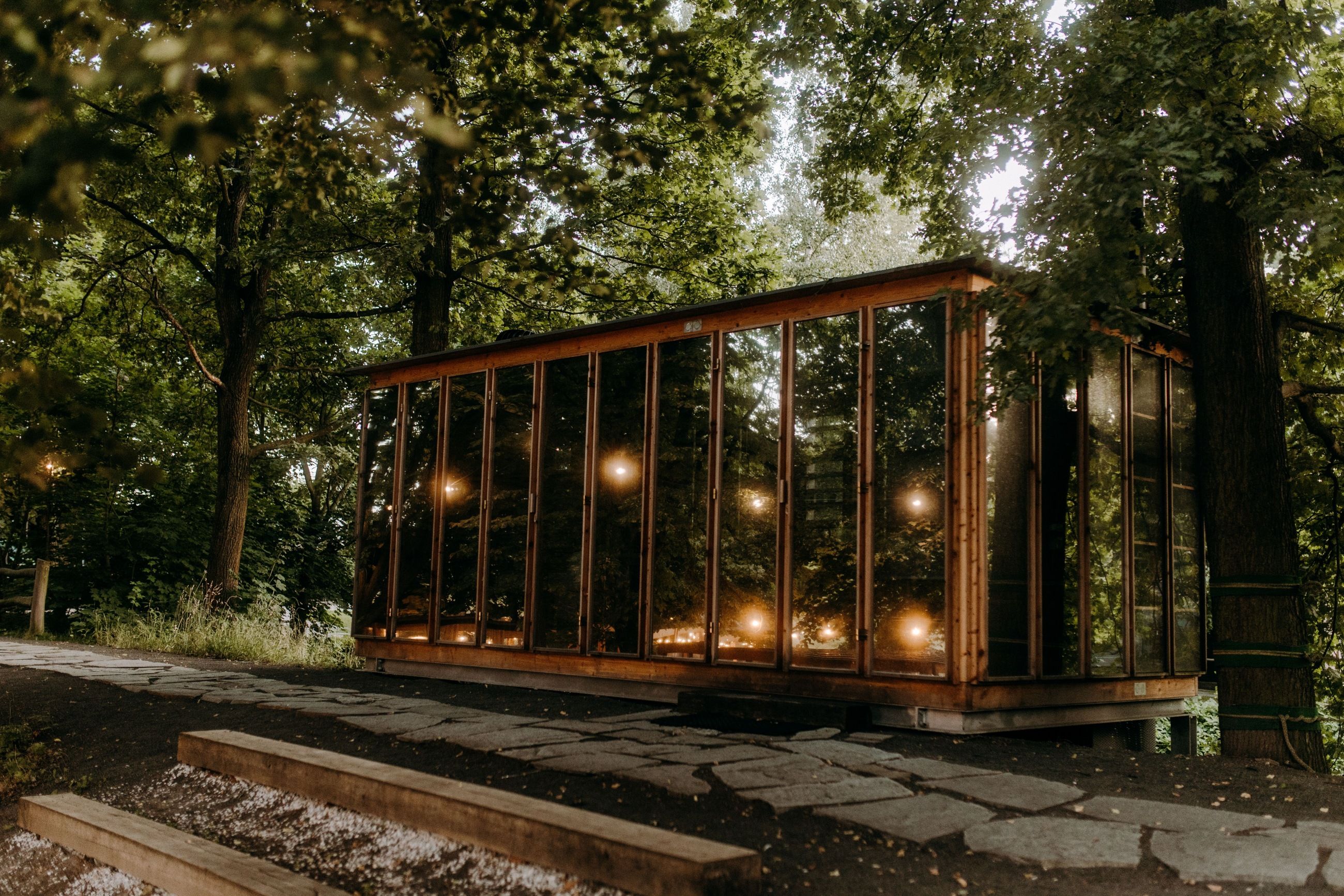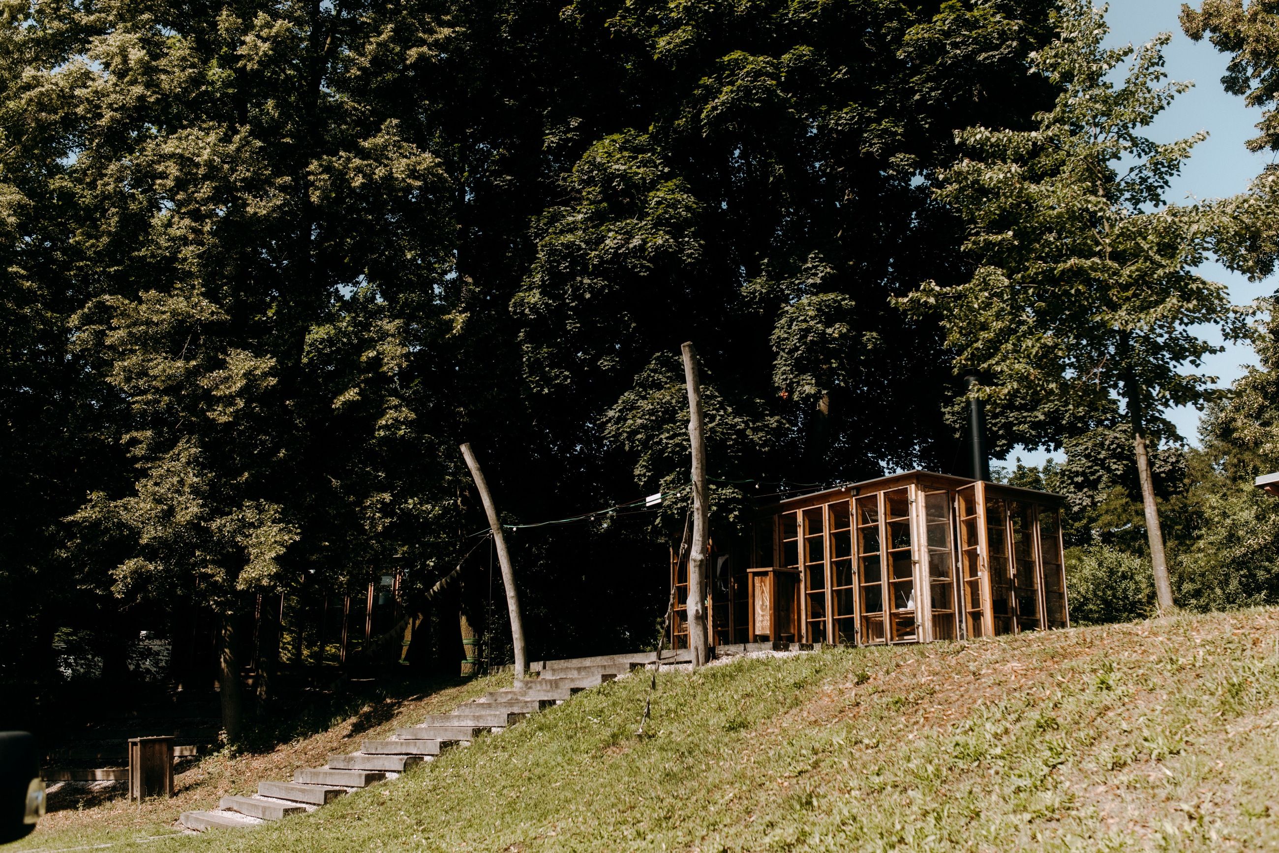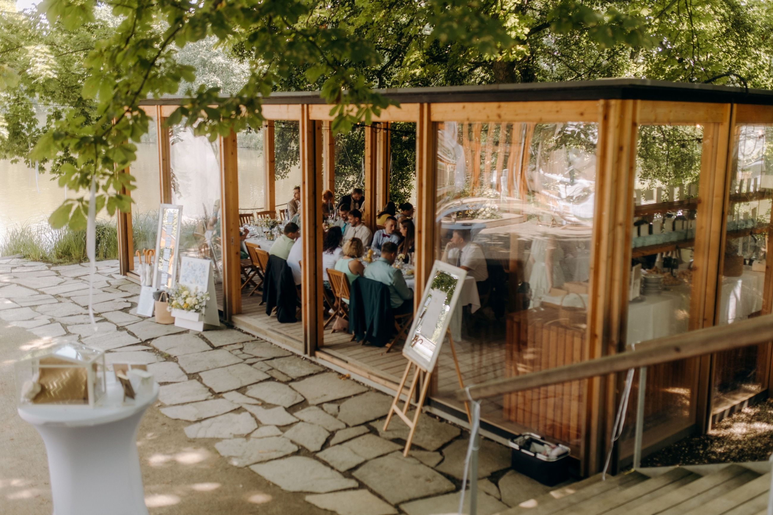 obřadní místo s výhledem na řeku a zázemím stylových kabinek říční plovárny